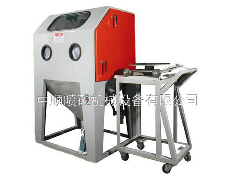 2、配備活動臺車和轉盤,操作時將工件放在轉盤上,然后推入機內即可噴砂作業,操作簡單省力。