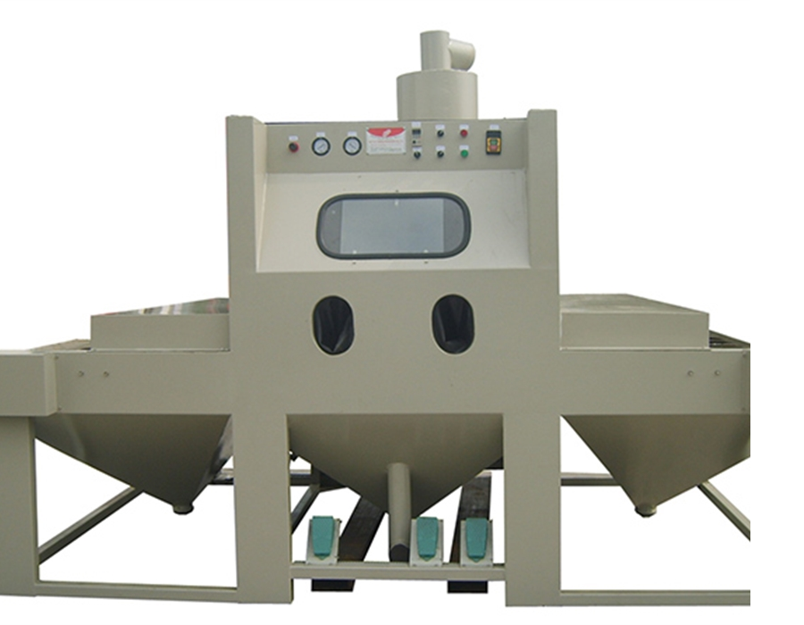 1、本機采用三角皮帶輸送工件,不會積砂,皮帶速度配合噴砂工藝要求可實現(xiàn)變頻調(diào)速。